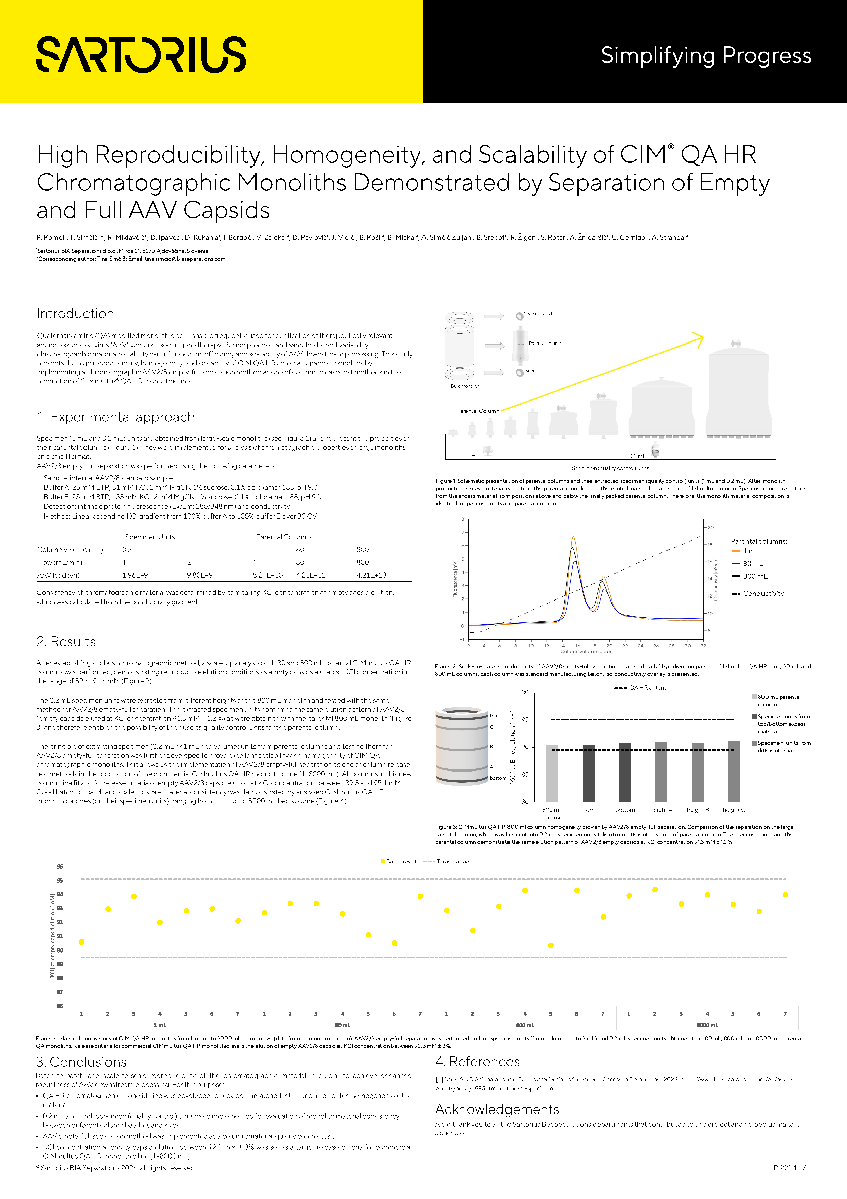 For this purpose we have first set up reproducible and highly controlled chromatographic conditions for separation of AAV8 capsids in an ascending KCl gradient using quaternary amine (QA) modified monolithic columns. Separation of empty and full AAV8 capsids on 1, 8, 80 and 800 mL CIMmultus QA columns demonstrated reproducible elution conditions as empty capsids eluted at KCl concentration in the range of 89.4–91.4 mM. Extracting 200 μL units from the 800 mL monolith and testing them for AAV8 separation with the same method confirmed the same elution pattern as obtained with the parental column. The principle of extracting small units (specimen) and testing them for AAV separation was further developed to prove excellent scalability and homogeneity of CIM QA chromatographic monoliths. Specimen (200 μL or 1 mL bed volume) enabled implementation of AAV8 separation as one of column release test methods in the production of the commercial CIMmultus QA HR monolithic line (1–8000 mL). All columns in this new column line fit a strict release criteria of empty AAV8 capsid elution at KCl concentration between 89.5 and 95.1 mM and demonstrate good batch-to-batch and scale-to-scale material consistency.