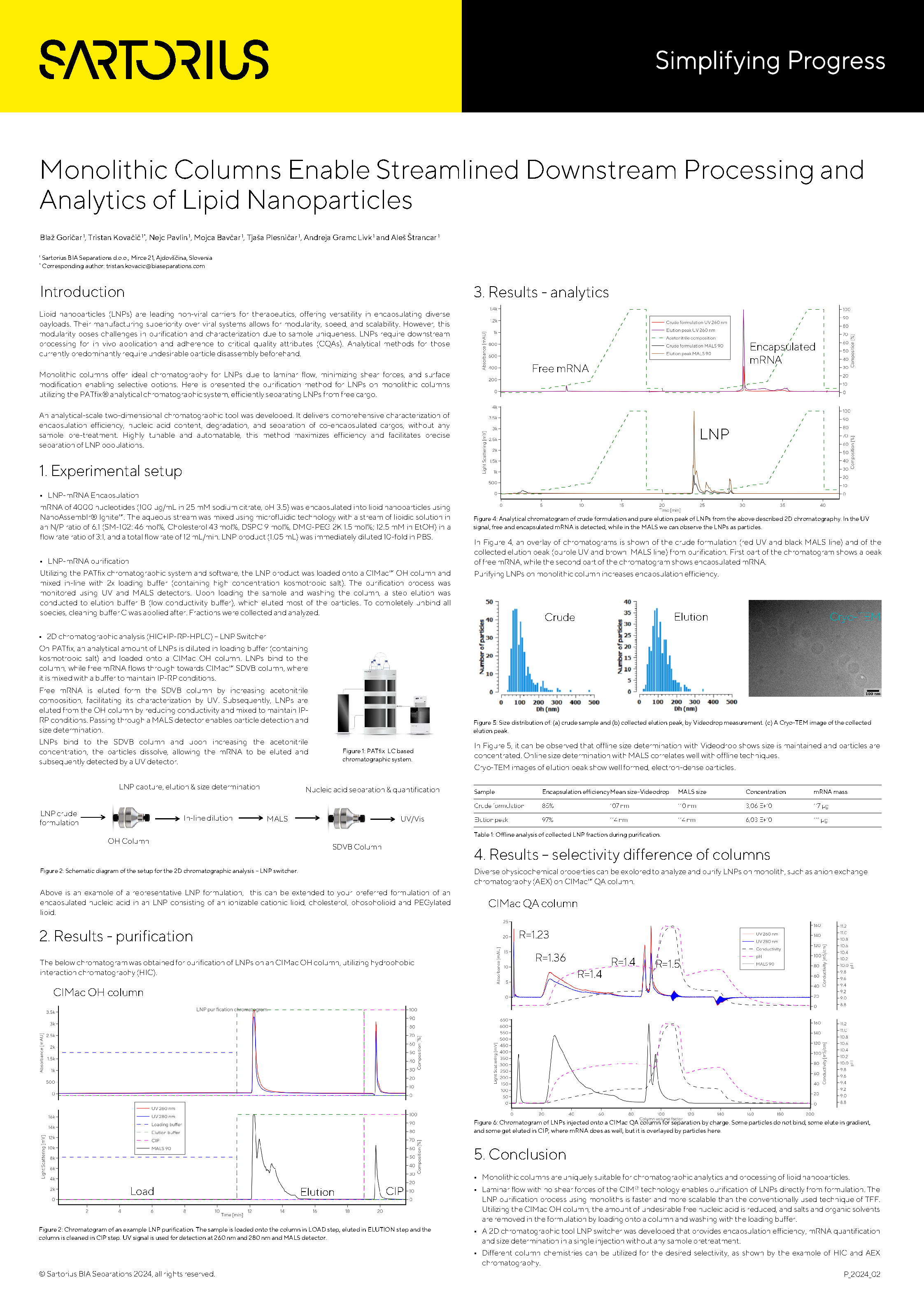 Monolithic columns offer ideal chromatography for LNPs due to laminar flow, minimizing shear forces, and surface modification enabling selective options. Here is presented the purification method for LNPs on monolithic columns utilizing the PATfix analytical chromatographic system, efficiently separating LNPs from free cargo.