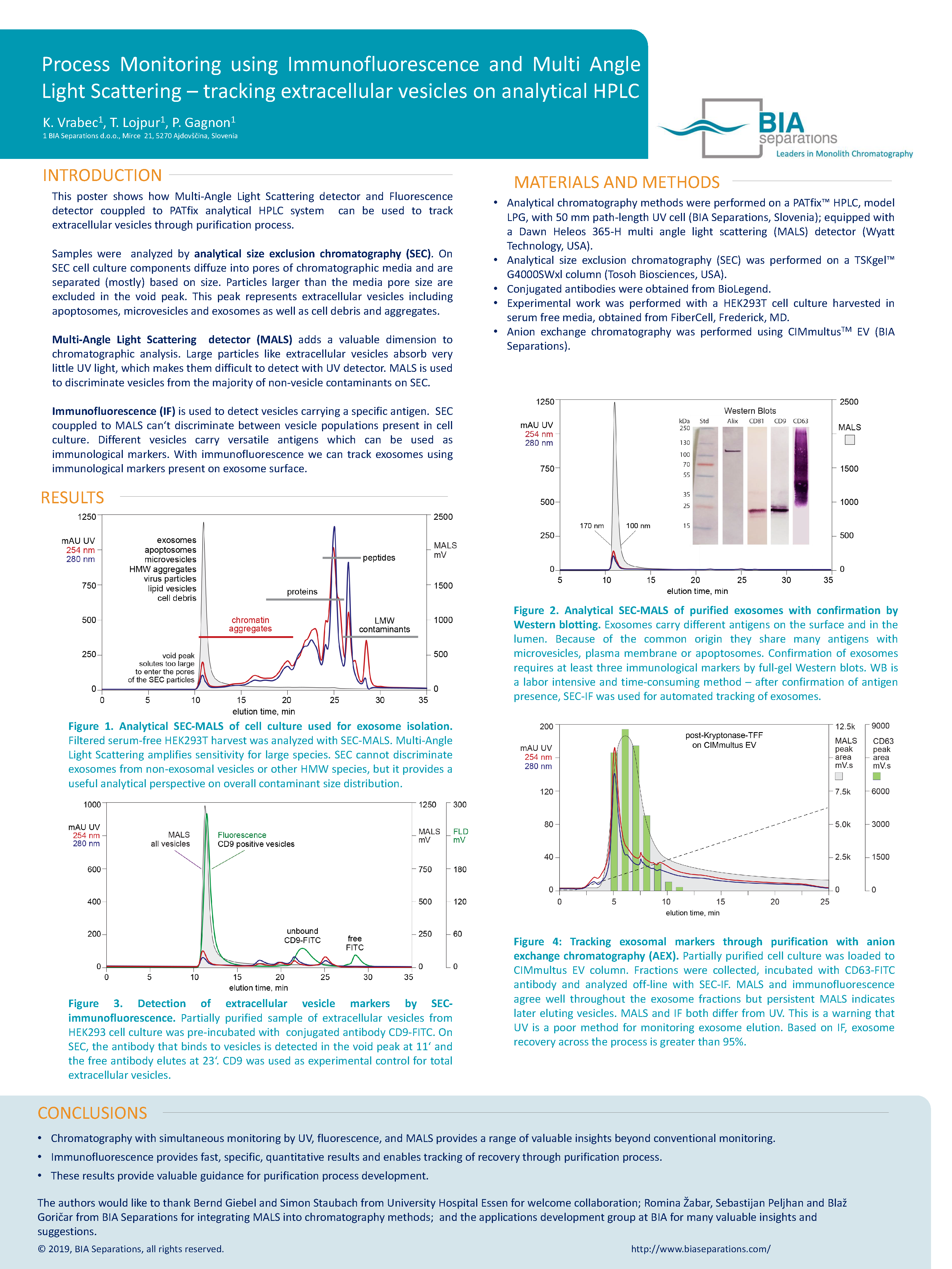 This poster shows how Multi-Angle Light Scattering detector and Fluorescence detector coupled to PATfix analytical system can be used to track extracellular vesicles through purification process. Samples were analyzed by analytical size exclusion chromatography (SEC). On SEC cell culture components diffuse into pores of chromatographic media and are separated (mostly) based on size. Particles larger than the media pore size are excluded in the void peak. This peak represents extracellular vesicles including apoptosomes, micro vesicles and exosomes as well as cell debris and aggregates.
