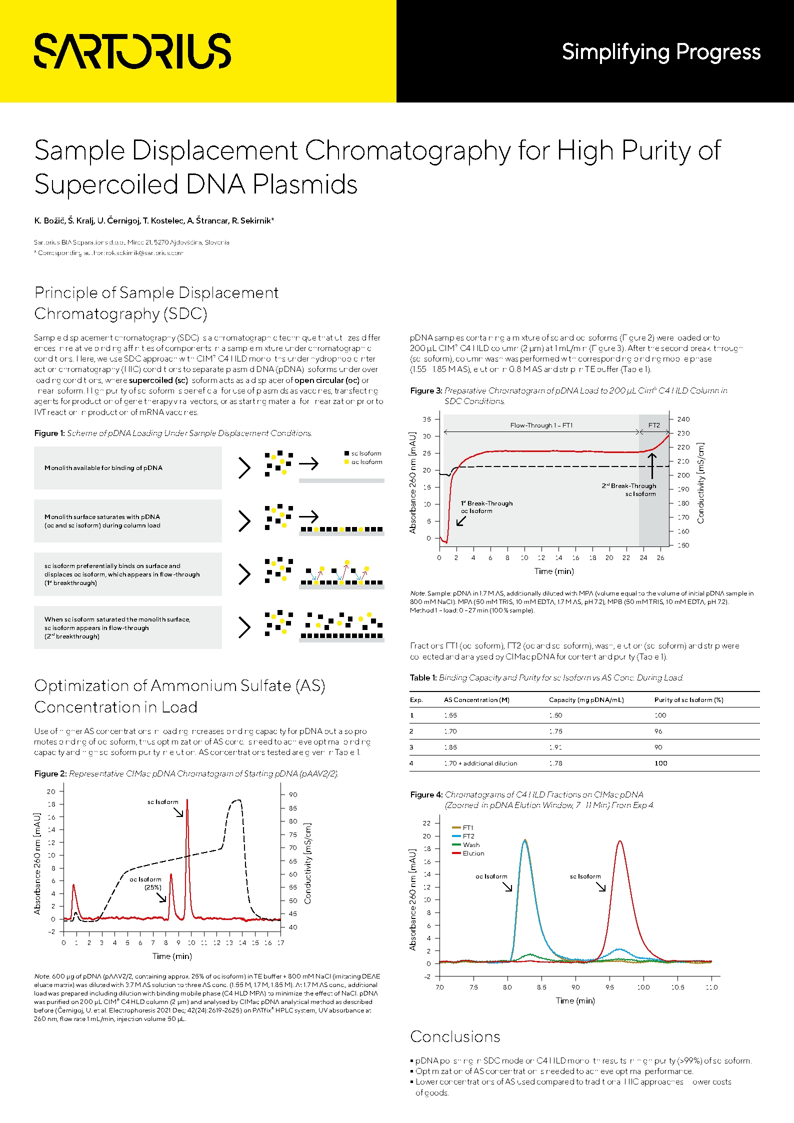 Here, we use SDC approach with CIM C4 HLD monoliths under hydrophobic interaction chromatography (HIC) conditions to separate plasmid DNA (pDNA) isoforms under overloading conditions, where supercoiled (SC) isoform acts as a displacer of open circular (OC) or linear isoform. High purity of SC isoform is beneficial for use of plasmids as vaccines, transfecting agents for production of gene therapy viral vectors, or as starting material for linearization prior to IVT reaction in production of mRNA vaccines.