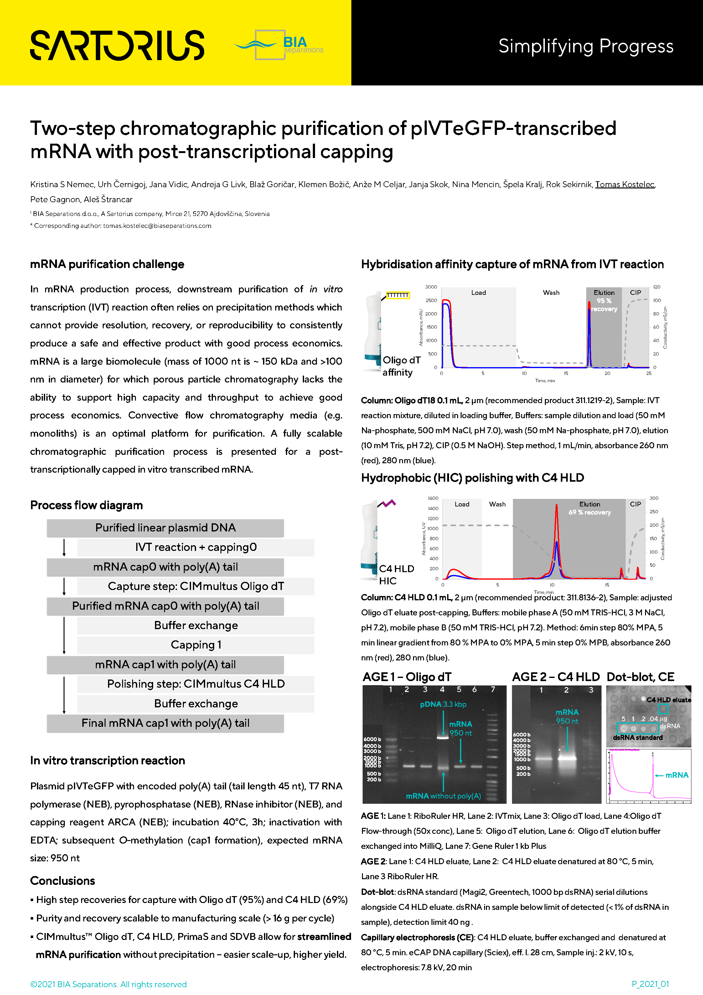 In mRNA production process, downstream purification of in vitro transcription (IVT) reaction often relies on precipitation methods which cannot provide resolution, recovery, or reproducibility to consistently produce a safe and effective product with good process economics. mRNA is a large biomolecule (mass of 1000 nt is ~ 150 kDa and >100 nm in diameter) for which porous particle chromatography lacks the ability to support high capacity and throughput to achieve good process economics. Convective flow chromatography media (e.g. monoliths) is an optimal platform for purification. A fully scalable chromatographic purification process is presented for a posttranscriptionally capped in vitro transcribed mRNA.